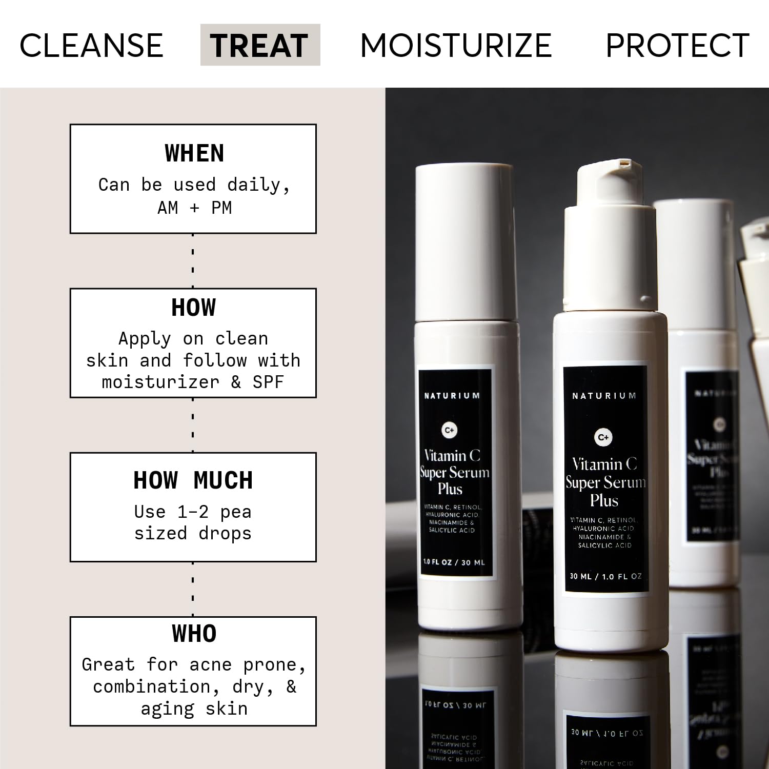 - MOST SKIN TYPES: Appropriate for those with aging, blemish-prone, combination, and dry skin, though a patch test prior to use is advised. Can be applied daily (AM + PM), using 1-2 pea sized drops on clean skin, following with a moisturizer and SPF