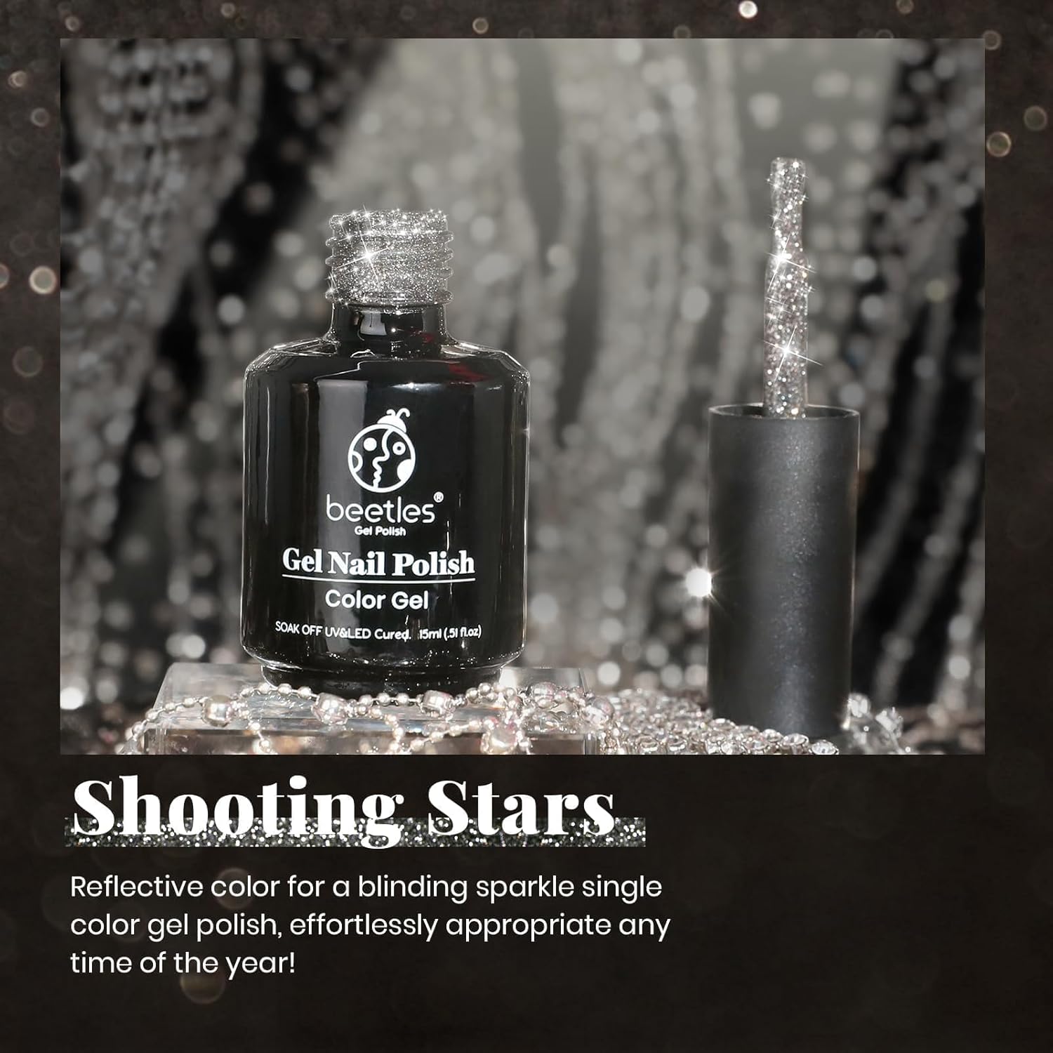 - Personal Style: Beetles diamond gel nail polish reflective black glitter color, sparkly nails shining differently under different lights.Black glitter gel polish will match any outfit you style your nails with all season Color Number: e727