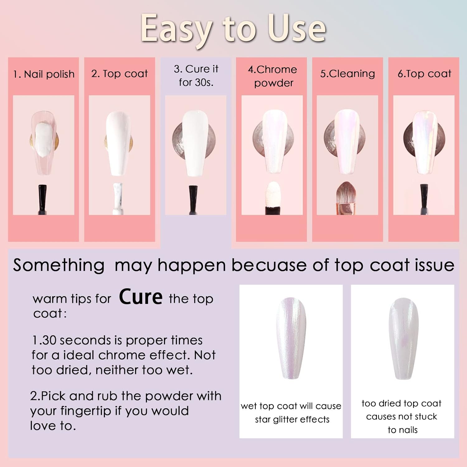 - Easy to Use: The chrome powder stuck well to the nails that applied No-wipe Top Coat. You can easily get salon-quality chrome results. To make it easy to use the powder, we provide detailed steps and tips in the images. Use it and try more DIY nails with chrome hearts nail charms, flatback rhinestones, and nail stickers.