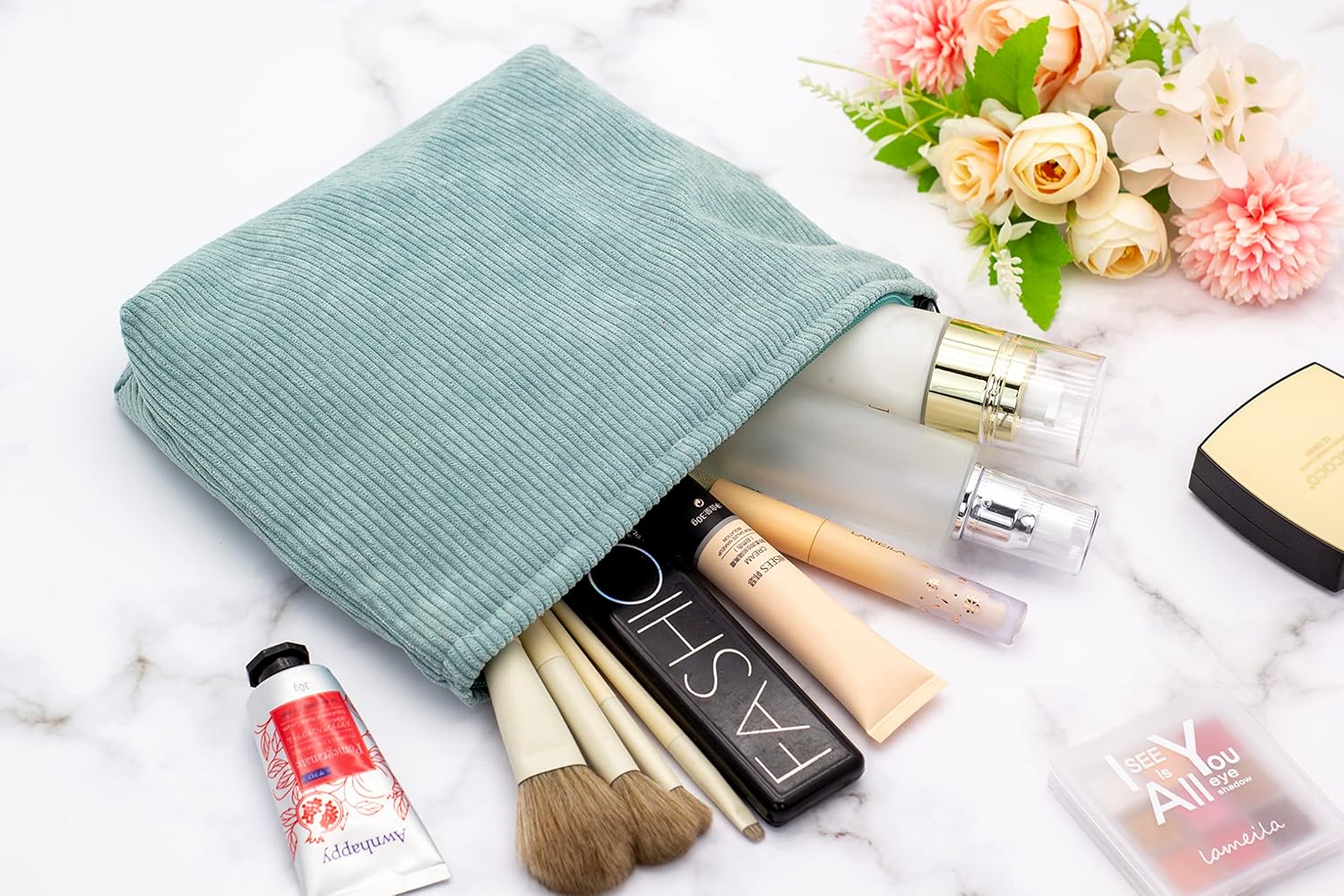 PAZIMIIK Makeup Bag Large Zipper Corduroy Make Up Pouch for Purse Travel Canvas Cosmetic Organizer for Women Brush Storage,Blue