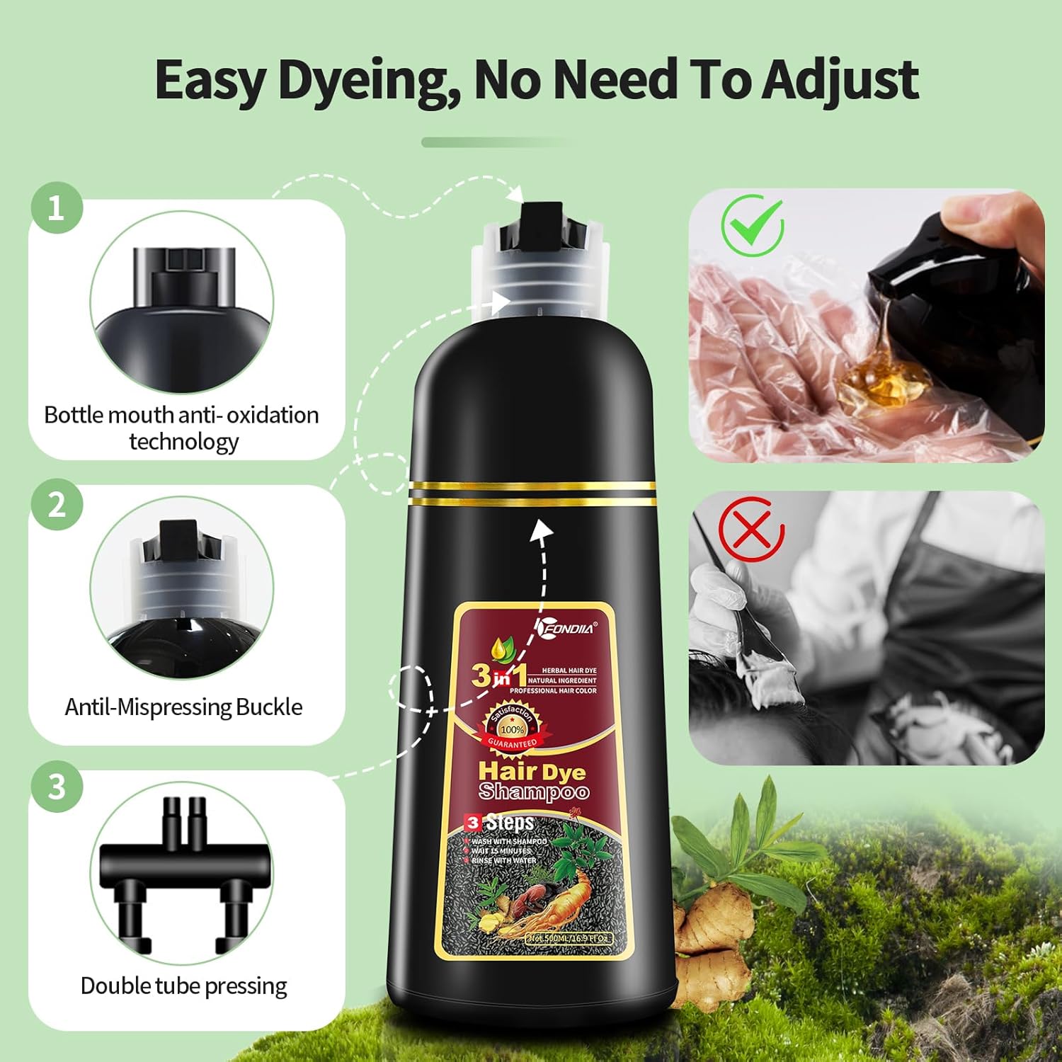 - Note: Different hair base colors dye out with slight deviation. When dyeing hair, it is recommended to apply cream at the intersection of hair and skin, so as to avoid dyeing to the skin. If you're not completely satisfied with our 3-in-1 hair coloring shampoo, we offer a 100% satisfaction guarantee. Try it out risk-free and see the difference for yourself!