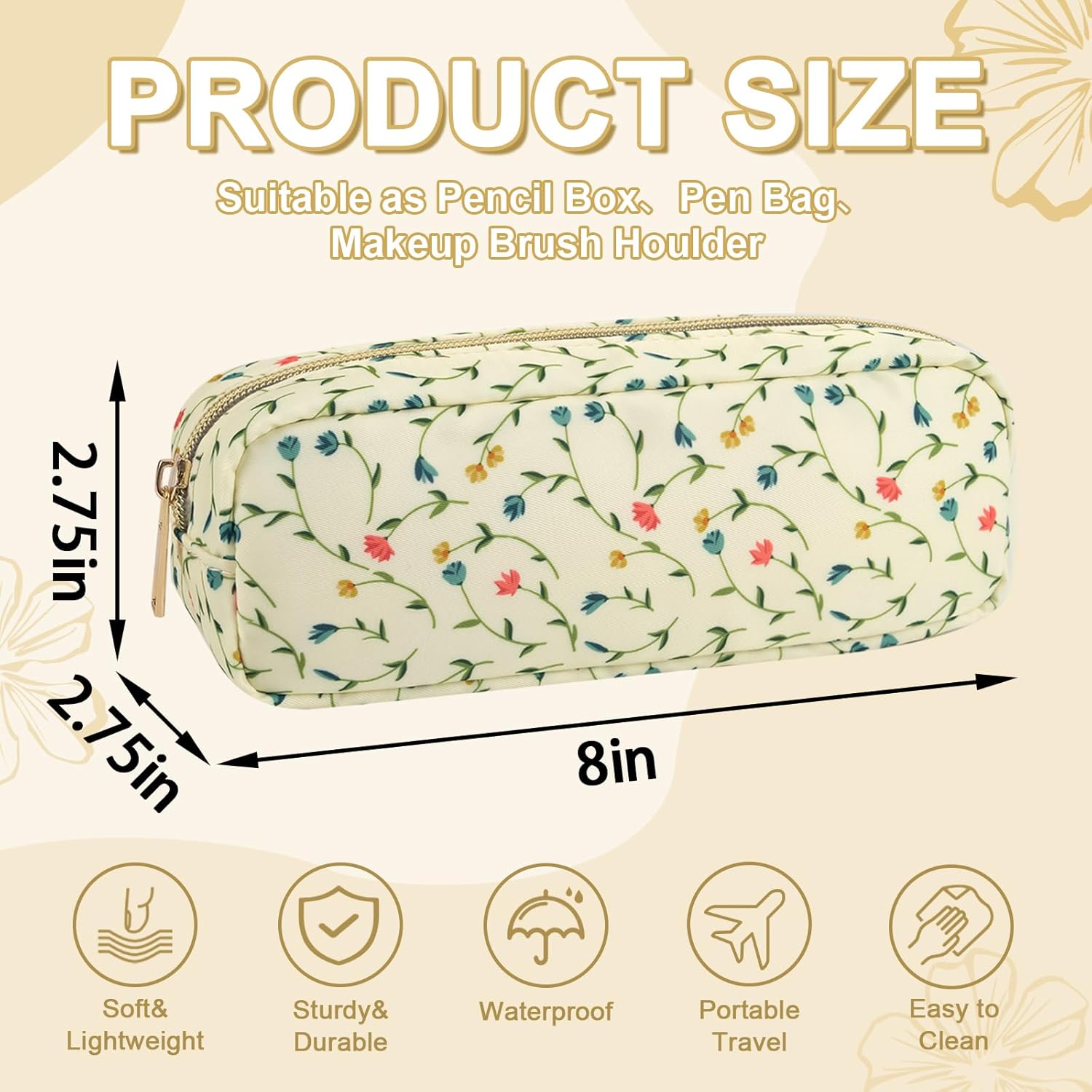 Waterproof Small Floral Pencil Case Makeup Bag for Purse,Cute Flower Pencil Pouch Preppy Nylon Makeup Brush Holder with Zipper,Girls Portable Storage Case Pen Bag for Work(Slim Light Yellow-Flowers)