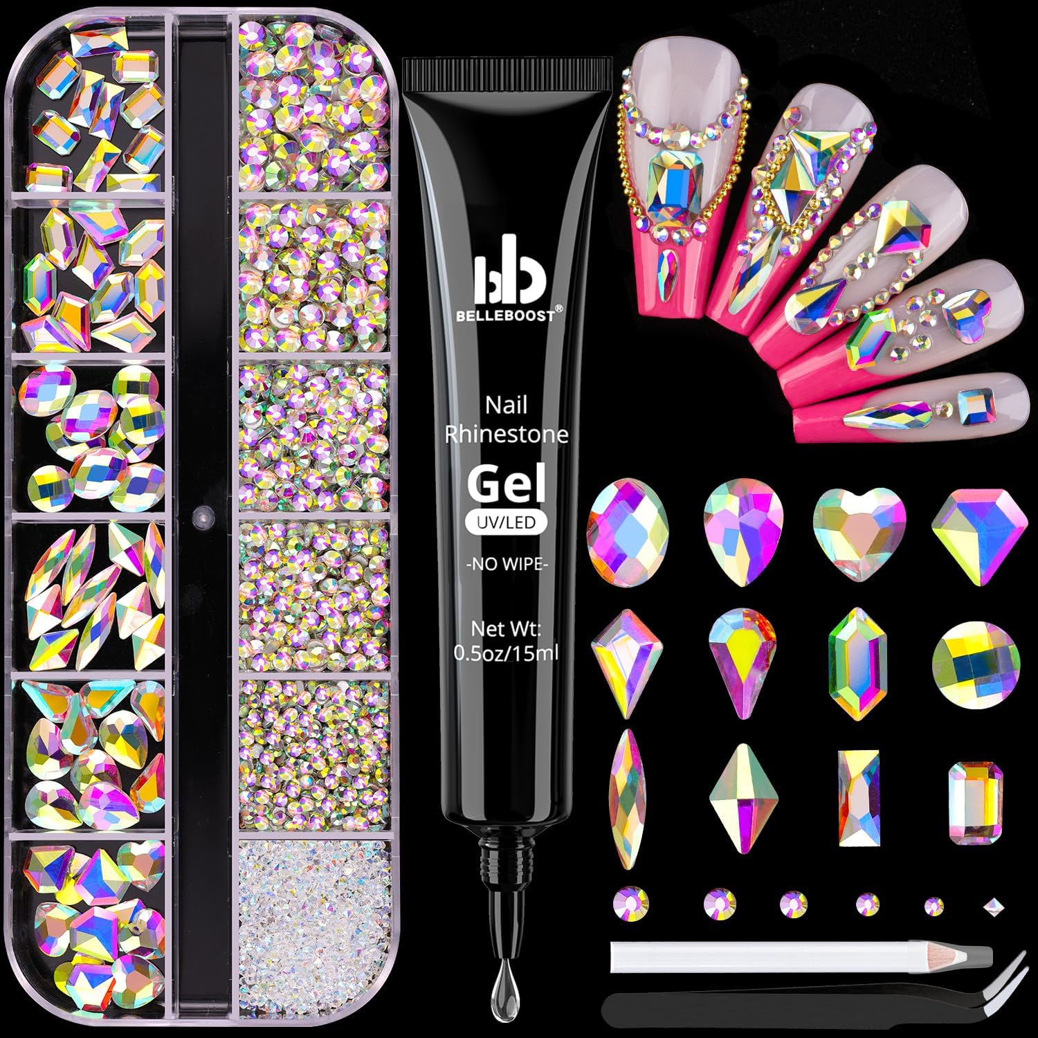 - 💎PACKAGE CONTENT -- The package contains 60Pcs multi shapes flatback gems crystal and 2000Pcs 1.5-4mm round beads, totally 2060Pcs Champagne Gold rhinestones. Additionally, 1 tweezers for large size gems and 1 pickup pen for small size gems. 1 15ml rhinestones glue gel for nail design. This rhinestones kit makes it easy for you to make any nail art you like, and will bedazzle your acrylic nails!