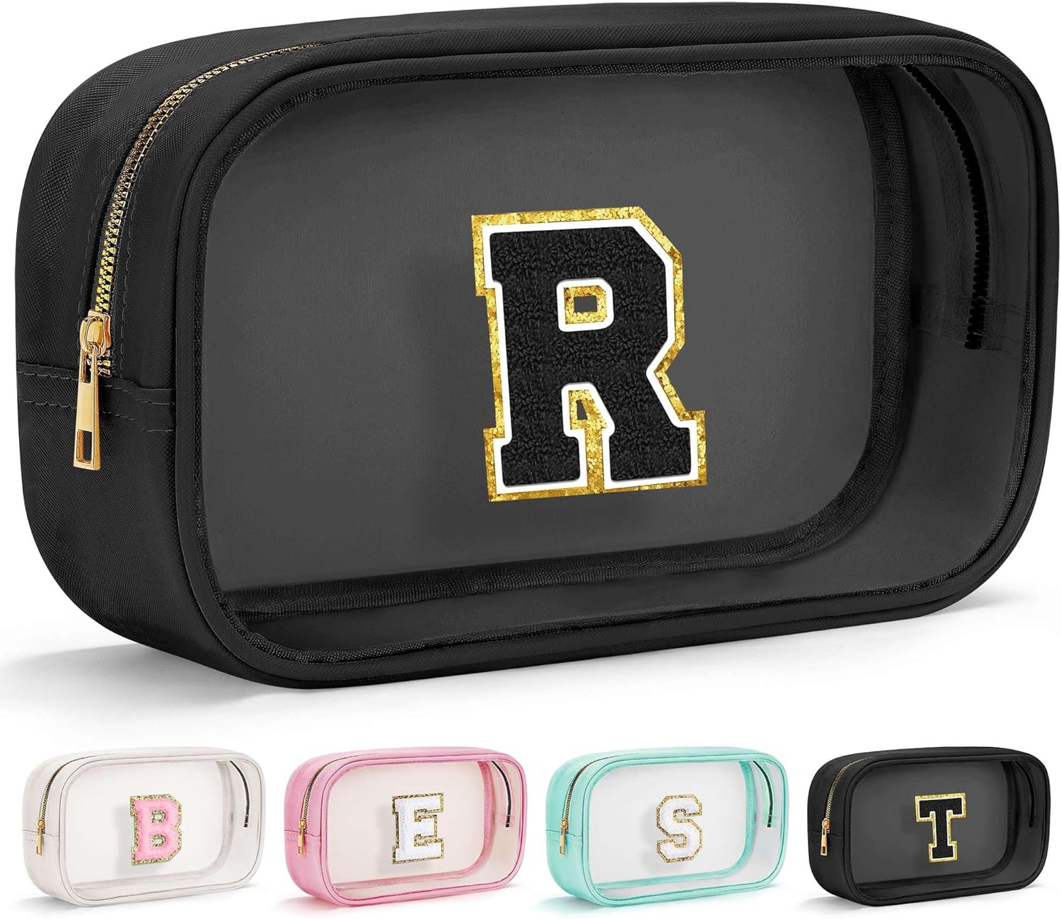 YOOLIFE Initial Travel Makeup Bag Pouch, Clear Toiletry Bag for Women Travel Accessories Cosmetic Bag Skin Care for Teen Make Up Bags Birthday Gifts for Women Unique Teacher Mom Friends Gifts Black R