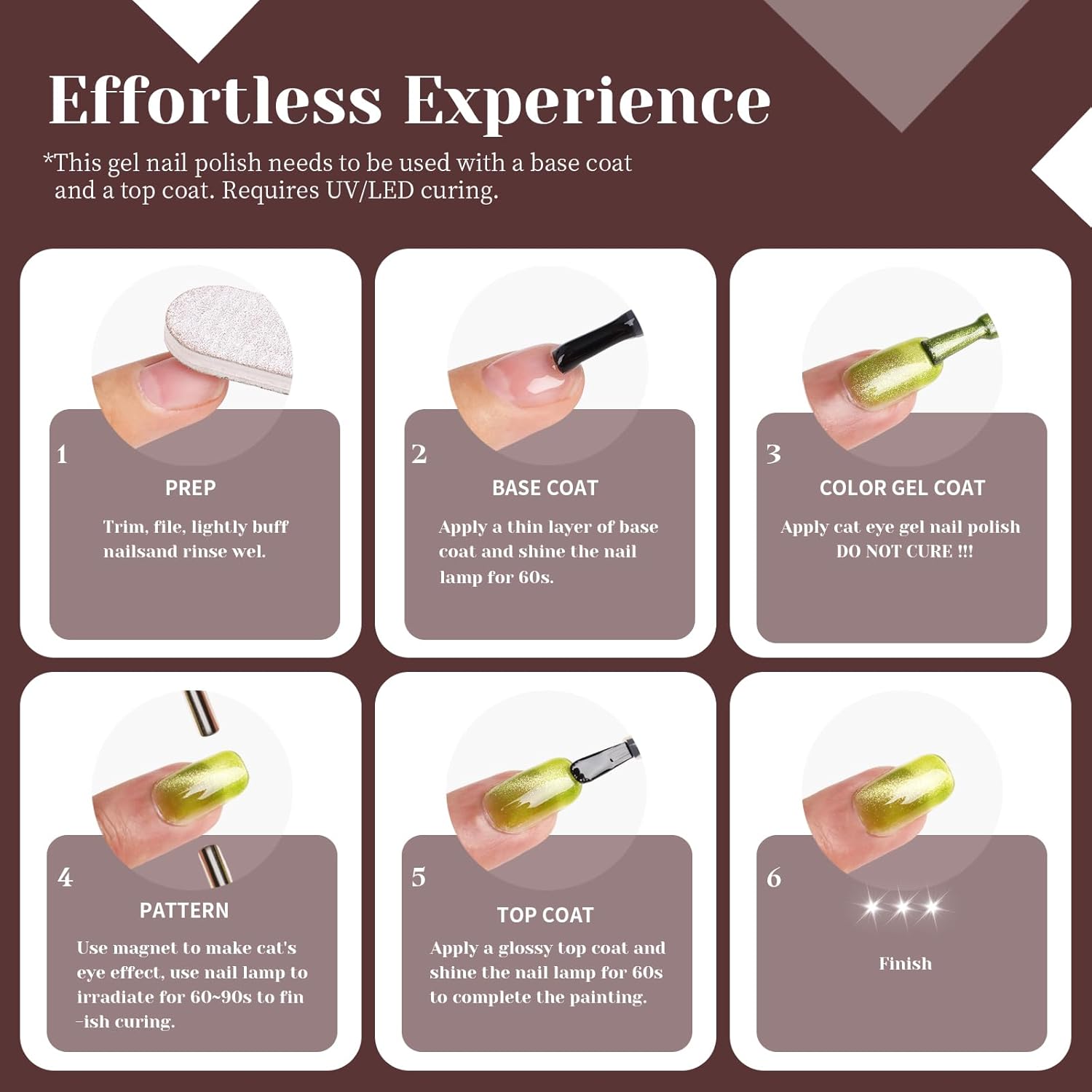 - Our brown cat eye gel nail polish is formulated to be long-lasting and durable. It can with stand daily wear and tear, ensuring that your manicure stays flawless for weeks. Say goodbye to chipped or faded nails with our high-performance gel formula.