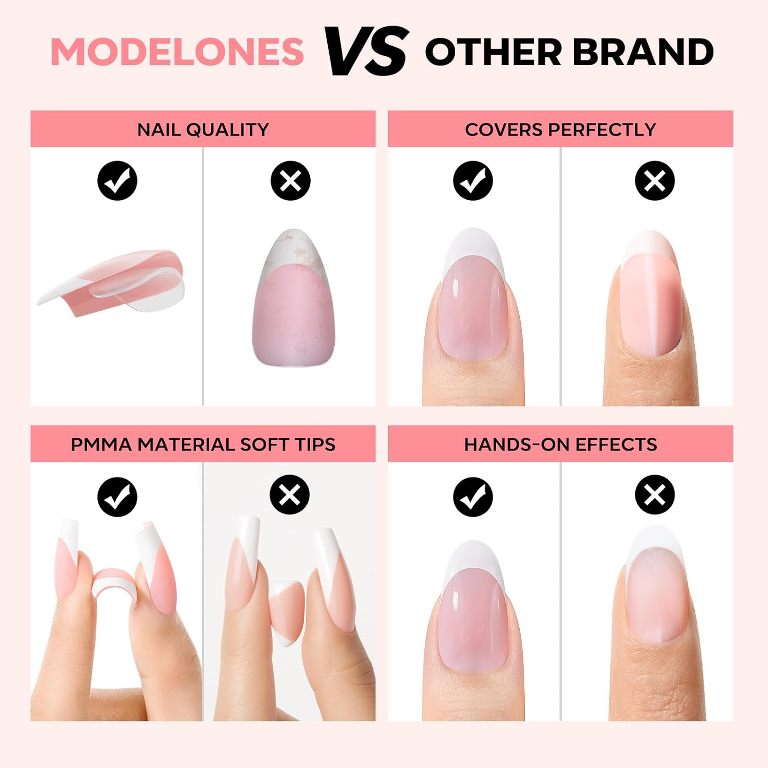 - PMMA Soft Material: These premium French nails tip feature flexible yet durable PMMA soft gel material with a pre-designed curvature that seamlessly blends with your natural nail shape for a flawless, salon-quality finish.