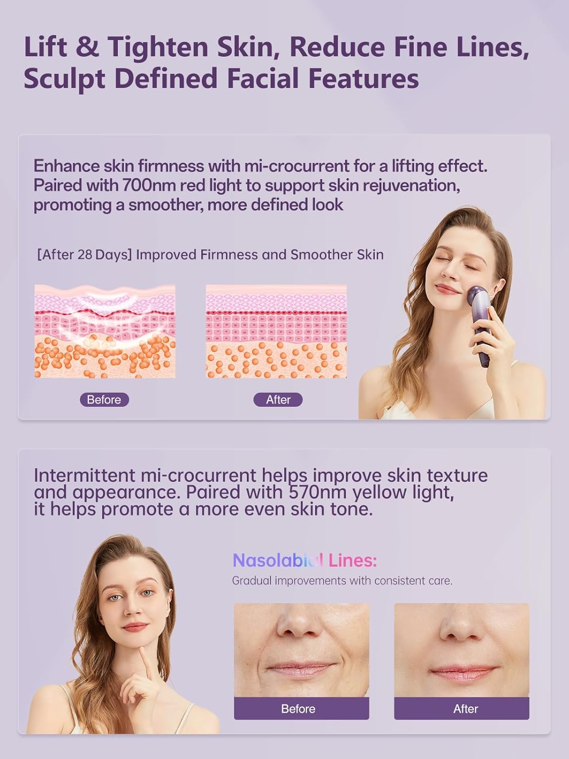 6-in-1 Age-Defying - Eye, Face & Neck Lift & Firm, 5-Color Light Therapy for Face with Microcurrent, Vibration, Heat & Cooling, Skin Care Tool for Youthful & Tightening Skin (Purple)