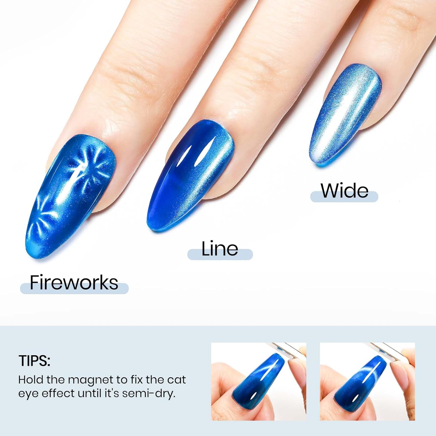 - Trendy Cat Eye Nail Polish: 1*15ml larger bottle nail polish - Blue. Perfect for daily wear, work, parties, trips, beaches, and any occasion where you want to add a pop of color to your look. Highly versatile and easy to apply, this elegant shade will steal the show wherever you go.