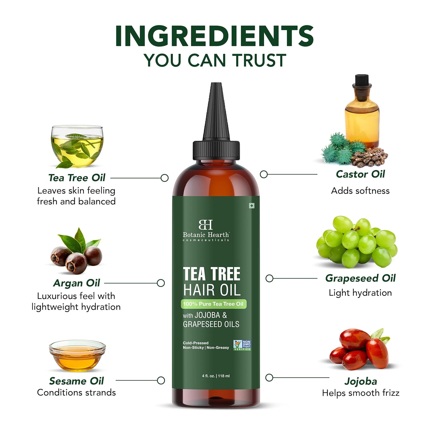 Botanic Hearth 100% Pure Tea Tree Oil (4 Fl Oz) | With Jojoba & Grapeseed Oils | Soothes Itchy Scalp & Fights Dandruff | Hair Oil Repairs Dry Damaged Hair, Strengthening, Healthier Hair- Hair Tonic