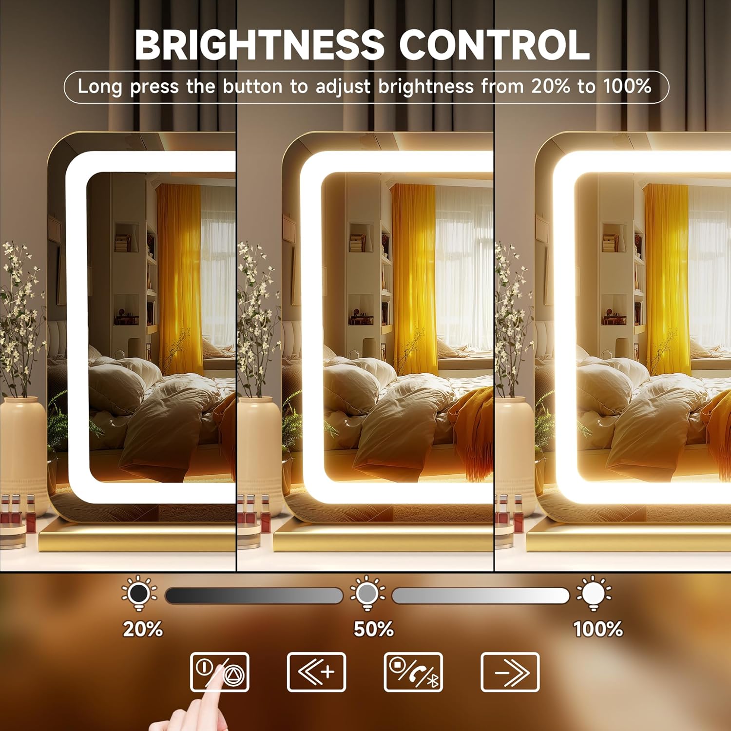 - đăSmart Touch Control & Memory FunctionăThis makeup mirror with lights has 3 smart touch buttons, turn on/off the light by touching the sensor switch, press the left button to change the color modes, and long press the right button to adjust the LED brightness. This lighted makeup mirror is designed for memory function and keeps your lights set like last use.