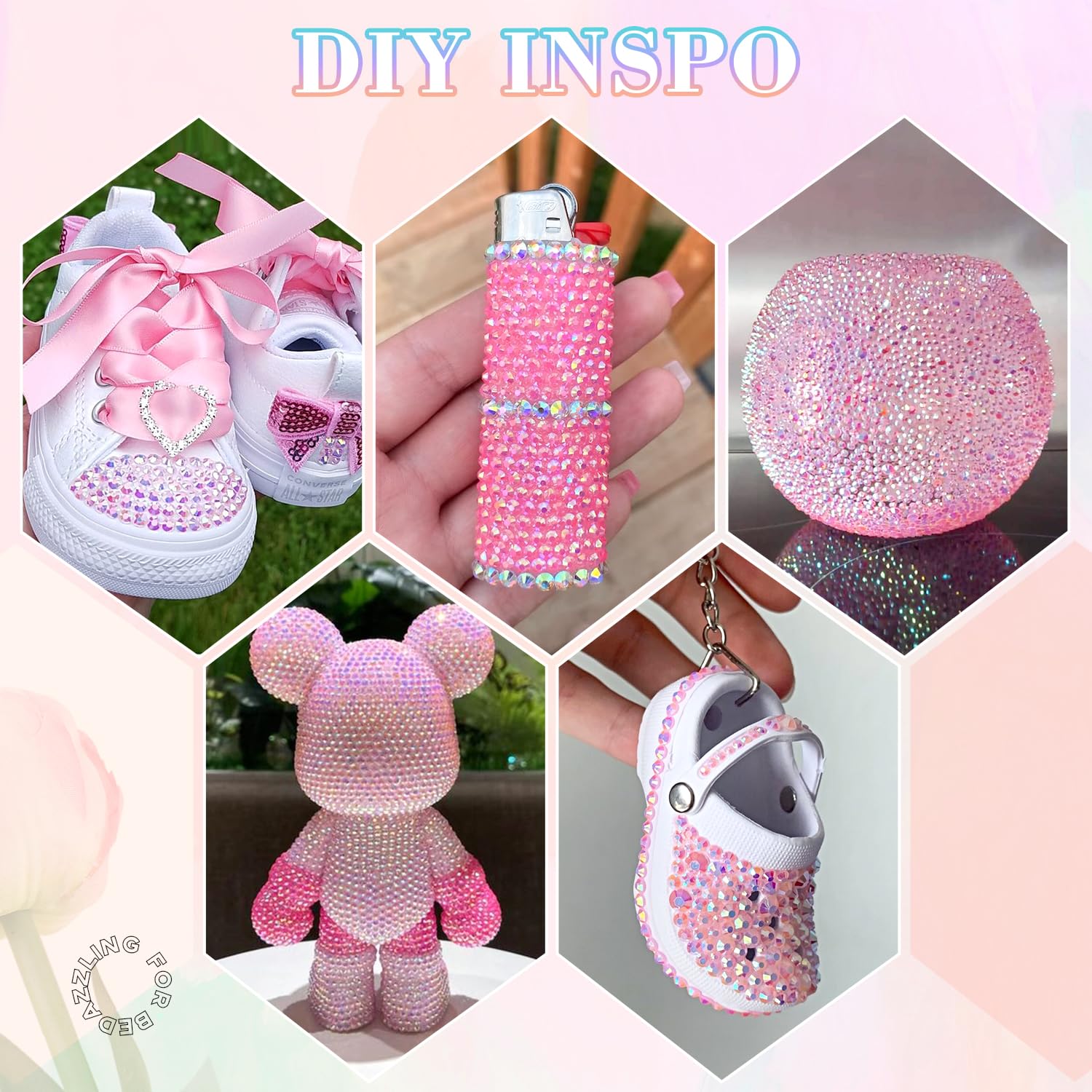 - PACKAGE CONTENT – This all-in-one bedazzler kit includes everything you need to start creating dazzling designs: 1 box of Light Pink AB rhinestones with 24 grids (approx. 30,000 pcs of bedazzling rhinestones assorted size SS6/10/16/20/30 ), 1 precision tweezers, 1 pickup pen for handling small gems, and 3 tubes of B7000 jewelry glue for secure application.