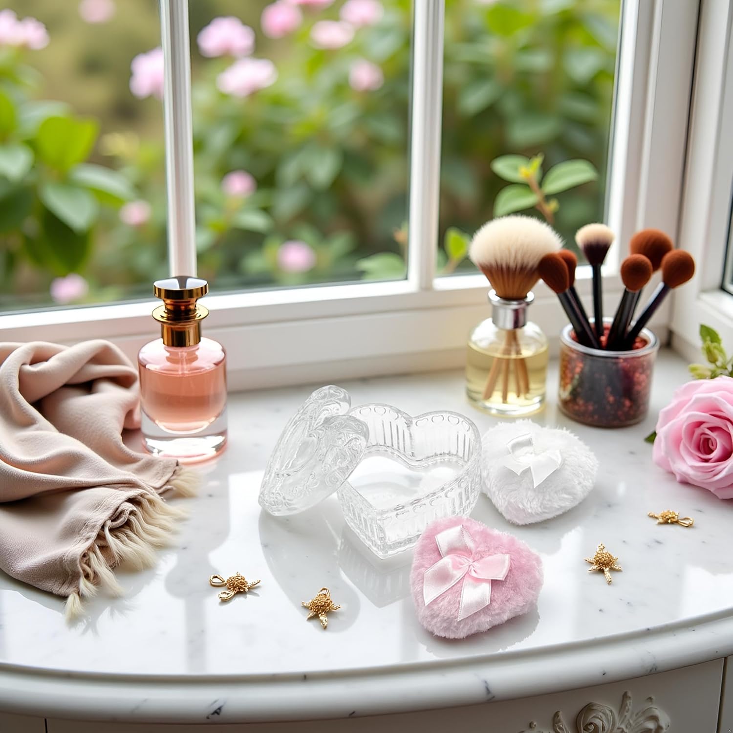 - MULTIPURPOSE GLASS HEART BOX This glass powder puff container can not only be used to organize your powder puffs, but also can be used to store earrings, rings, bracelets, hair accessories, trinkets and other items on your dressing table, bathroom and bedroom. It can keep your items away from dust and water and play a protective and decorative role to meet the needs of female users for cosmetic organization