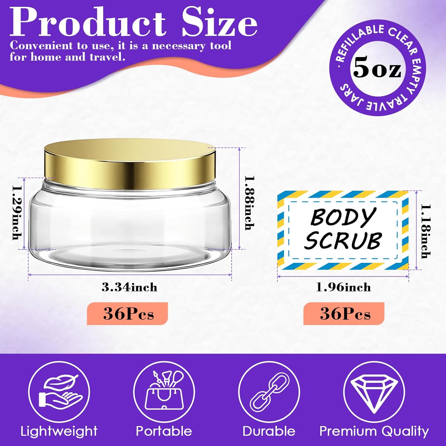 36 Pack 5 oz Plastic Cosmetic Containers With Lids Refillable Clear Empty Travle Jars Containers for Body Butter,Sugar Scrubs,Cream,Lotions,Candy, Waterproof Label&Spatulas - (White Lid)