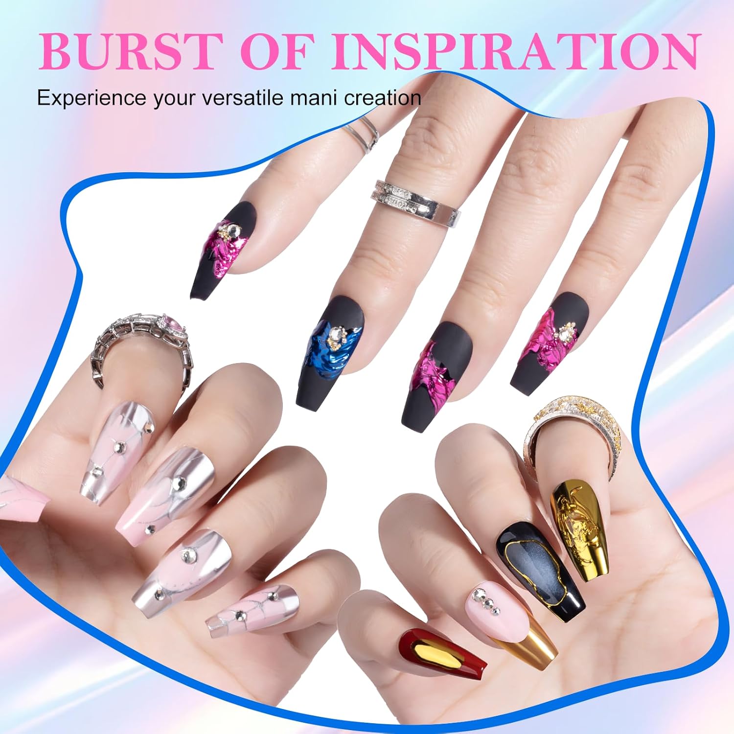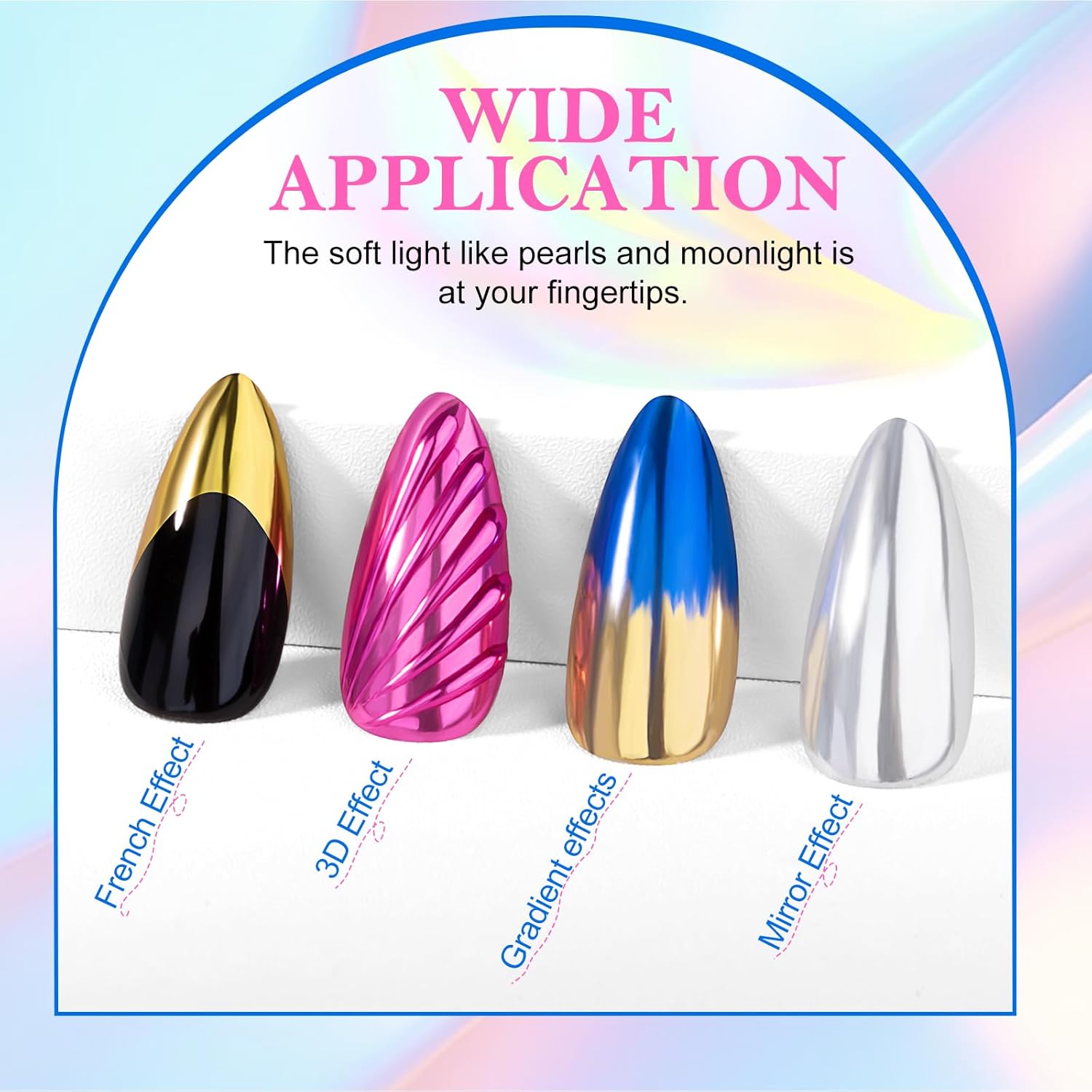 - Mirror Chrome Nail Powder: Make your nails shine like mirrors. You can create different effects with gel nail polish of various colors to make your nails more delicate and textured. Just a little powder and your nails will look different