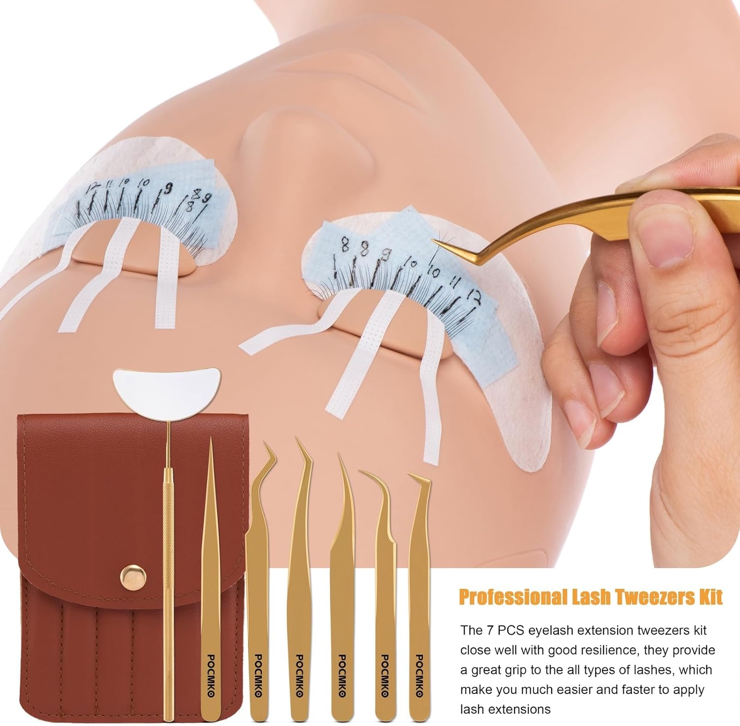 Lash Tweezers for Eyelash Extensions, Professional Eyelash Tweezer Set, Lash Extension Tweezer Kit (Set of 7, Gold)