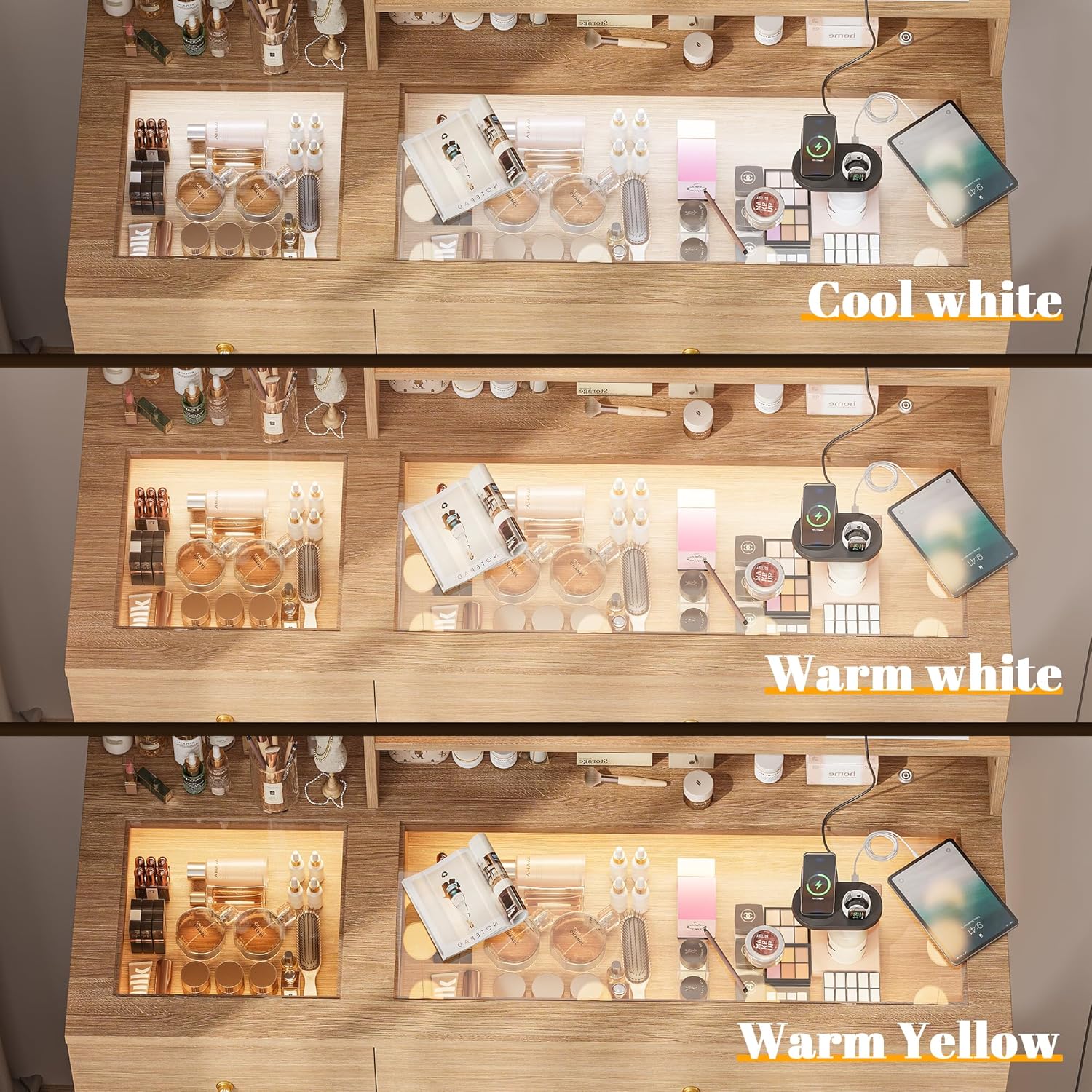 - ăGlass Top Vanity with RGB Drawersăwhite vanity desk is designed with a transparent tempered glass tabletop, you can easily see everything inside the vanity drawers. The built-in LED lights feature three color temperature modes, adding a touch of brightness and style to any room.